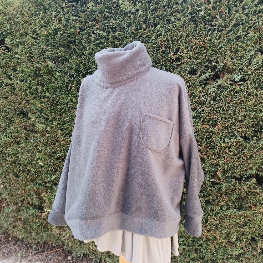Jersei ample de teixit polar de color gris fosc. Coll xemeneia i butxaca sobre el pit esquerre. Talla única.